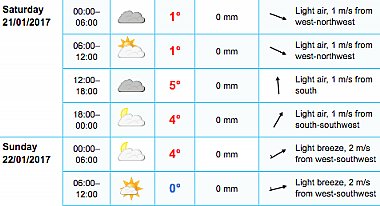 Temperatures will be on the cool side this weekend, reaching about 5°C during the day on Saturday and dropping down to just above freezing at night.